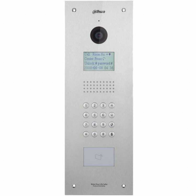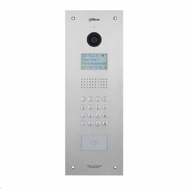 1.3 Мп багатоквартирна IP відеопанель. Стиснення: H.264. Функції: Тривога, кнопка відкриття/закриття дверей, статус дверей. Дозволяє залишати аудіо- та відеоповідомлення, групову розмову. Вбудований IC картрідер. Вбудований модуль розширення контролю доступу. DC 12В, 406х143х42 мм