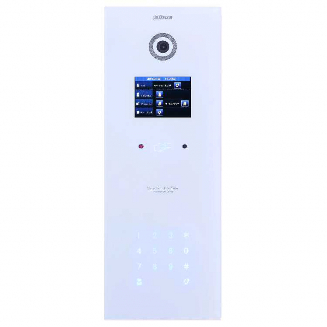2 Мп багатоквартирна IP відеопанель. Вбудований картридер IC. Функції: тревога, кнопка відкриття/закриття дверей, статус дверей. Дозволяє залишати аудіо та відео повідомлення, груповий розмову. DC 12В, POE (802.3af)
