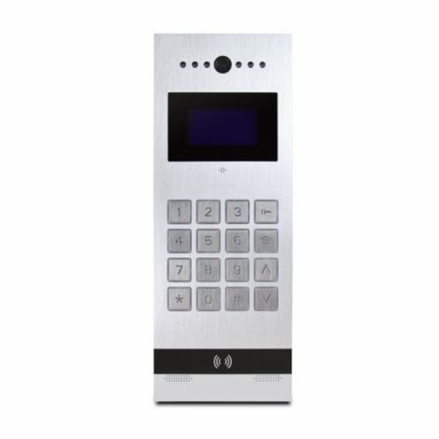 2 Мп IP видеопанель; Сжатие: H.264; 1/2.9" CMOS; f=2 мм (угол обзора 140 ° ); Экран 4,3"IPS. Разблокировка с помощью распознавания лица, пароля или карты. Степень защиты: IP55, IK08. Материал: алюминий. DC 12В/2 А, 410х154х51 мм