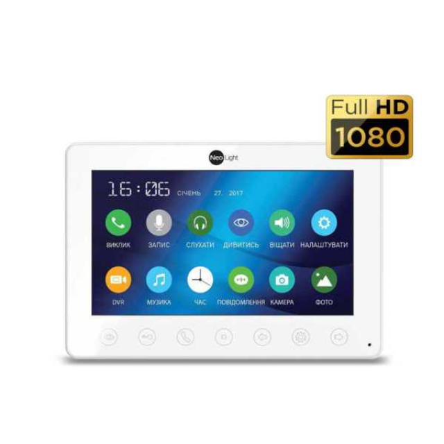 7-дюймовий FullHD 1080P AHD монітор із сенсорним екраном. Вбудований модуль Wi-Fi для віддаленого керування, функція віддаленого перегляду архіву. Підключення 2-х панелей виклику та 2-х відеокамер формату AHD з роздільною здатністю 1080Р, 5-х додатко...