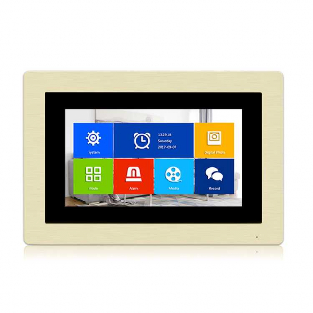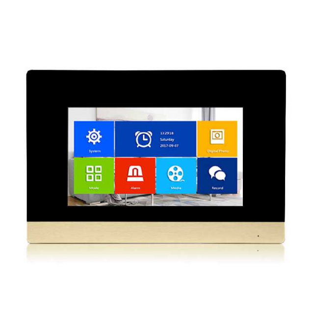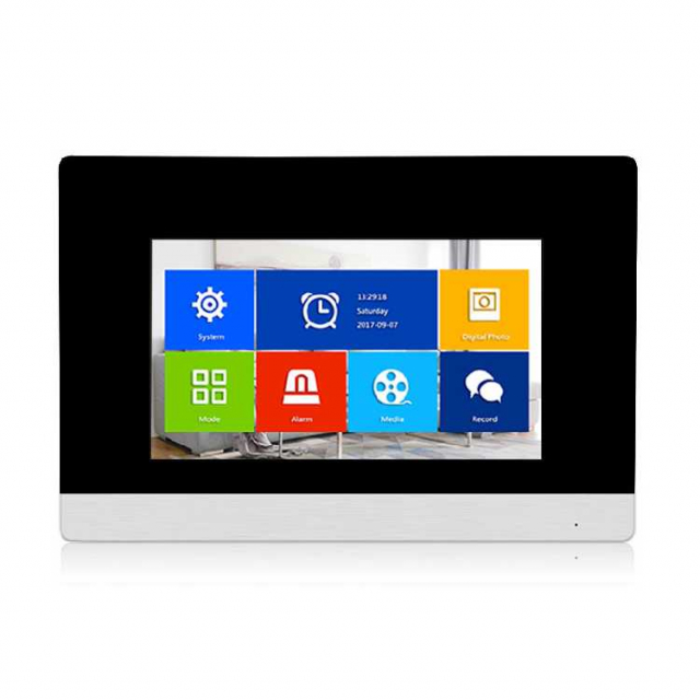 7-дюймовый цветной монитор с сенсорными кнопками. Подключение 2-х панелей вызова. Слот под micro SD карту памяти (до 32Гб). Встроенный Wi-Fi модуль для переадресации звонков на Android устройства. Подключение дополнительной аудиотрубки. Питание: AC 1...