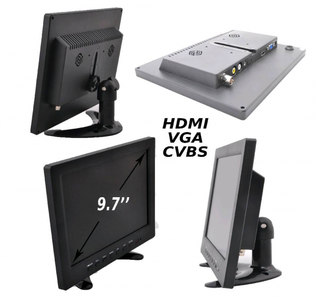 VGA, HDMI, LF відеовходи, блок живлення: 12V (650 mA Max), роздільна здатність: 1280 x 960, 16:9, яскравість - 350 кд/м2, контрастність - 800:1, розміри: 235 x 200 x 29 мм, вага - 900 г