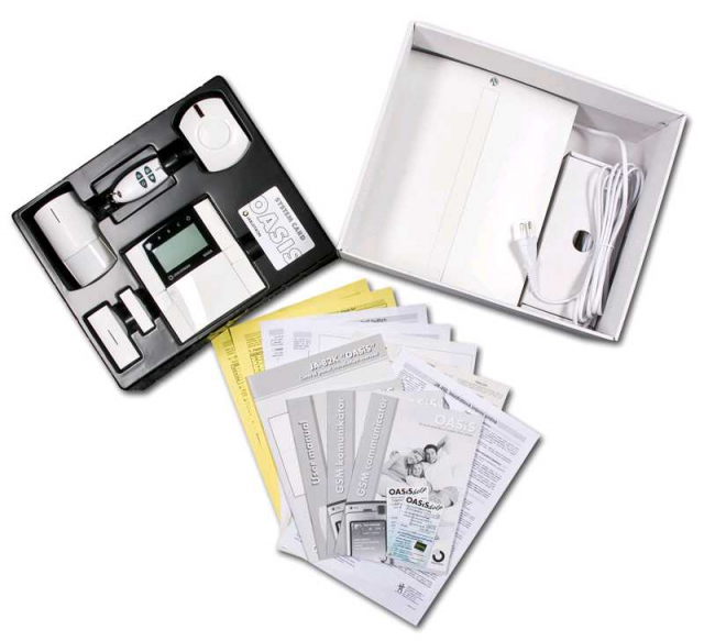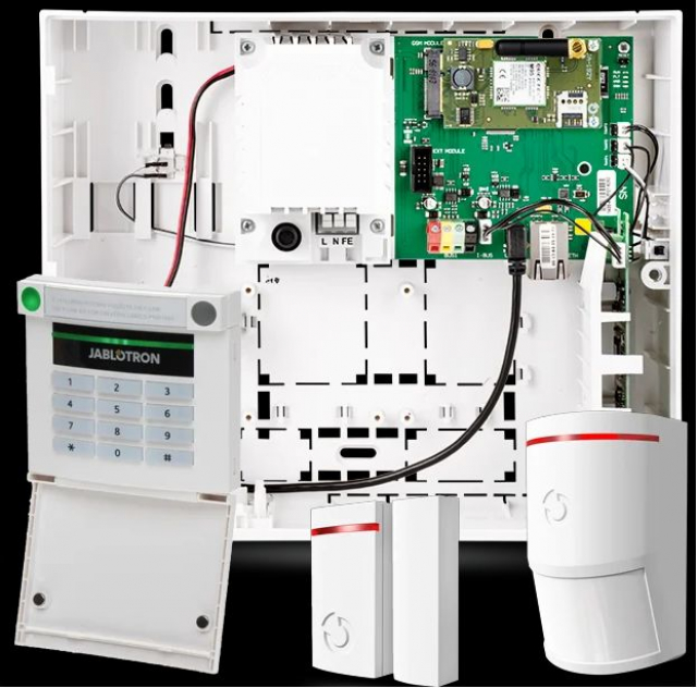 В комплект охранной сигнализации входит контрольная панель с радиомодулем JA-60KR, беспроводной модуль доступа JA-63F, два беспрповодных датчика движения JA-60P, беспроводной магнитный детектор открытия двери JA-60N, двухкнопочный брелок RC-11