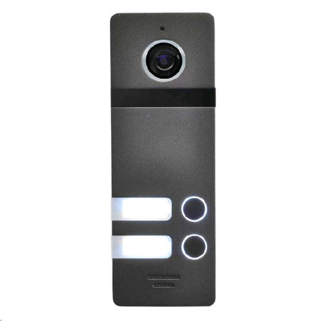 2-х абонентская панель вызова с невидимой ИК подсветкой. Встроенная видеокамера с разрешением 800 ТВЛ. Угол обзора: 110 град. Цвет корпуса: графит. Габаритные размеры: 54 х 153 х 18 мм