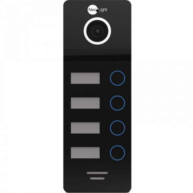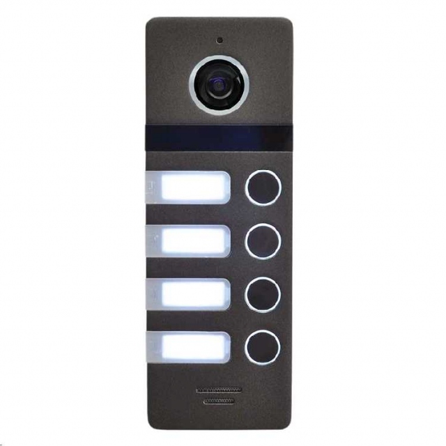 4-х абонентская панель вызова с невидимой ИК подсветкой. Встроенная видеокамера с разрешением 800 ТВЛ. Угол обзора: 110 град. Цвет корпуса: графит. Габаритные размеры: 54 х 153 х 18 мм