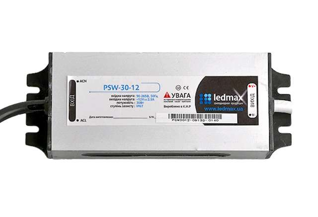 LED трансформатор 12В 2,5А (30W) PSW-30-12 Герметичный, влагозащищенный (Импульсный, входное напряжение 170-265 В, выходное напряжение DC 12В, выходной ток 2,5А, габариты Длина х Ширина х Высота (мм) 180 x 70 x 40)