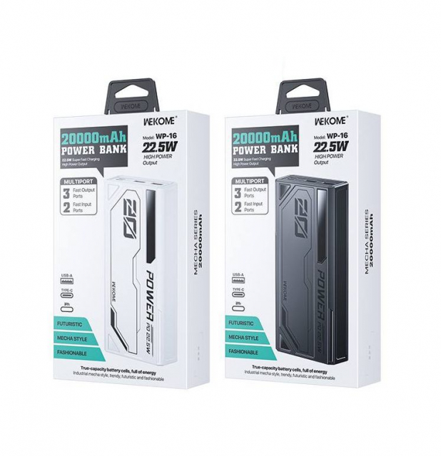 Powe Bank Wekome WP-16 (20000mah / 22.5W Супершвидка зарядка: 3 виходи / 2 входи, Габарити: 147*69*30 мм, Вага: 435 гр)