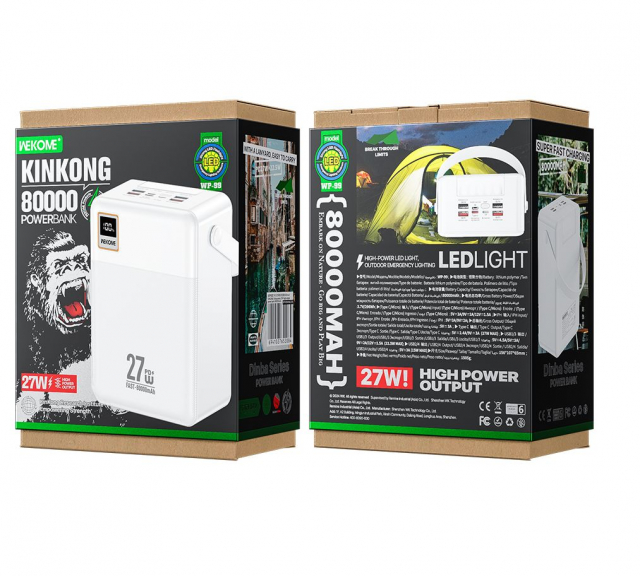Power Bank Wekome WP-99 white (80000mah / 27W Супершвидка зарядка: 3 виходи -USB*4+ Type-C/ 2 входи -Type C+Micro+iph , Габарити: 165*126*70 мм, Вага: 1505 гр)