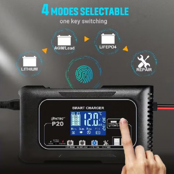 Зарядний пристрій для автомобільних акумуляторів має 4 режими на одній кнопці. З РК-екраном, напругою батареї, зарядним струмом, температурою заряджання, повним зарядом батареї тощо. Автоматичне перемикання між літнім і зимовим режимами для адаптації до температури довкілля для оптимального заряджання.