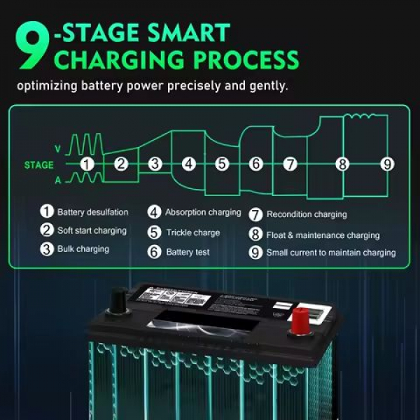 Автомобільний зарядний пристрій використовує 7-ступінчасту автоматичну зарядку, включаючи виявлення батареї, десульфатацію, підзарядку і т.д., для досягнення найкращої та ефективної зарядки. Режим ремонту використовується для ремонту та активації старих та розряджених акумуляторів. Мінімальна пускова напруга 7В.