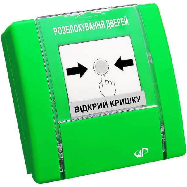 Напис - «Розблокування дверей», нормально-замкнуті контакти, зелений колір, механічна фіксація стану (повернення до чергового стану за допомогою ключа), без світлодіодних індикаторів, максимальний струм комутації силового ключа 500мА, ключа контролю 20мА, колір кнопки - білий