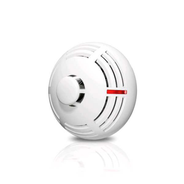Беспроводной комбинированный дымо-тепловой извещатель. Функции автодиагностики, оптическая индикация в тестовом режиме, включаемый удаленно тестовый режим, функции автодиагностики. Питание: батарея CR123A