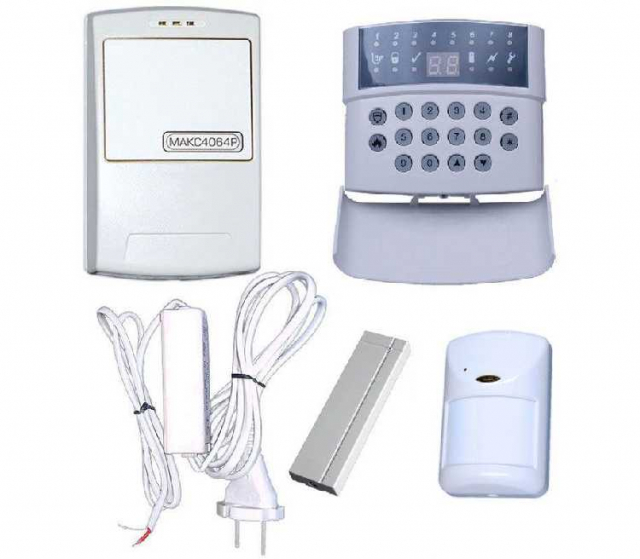 В комплект охранной сигнализации входит контрольная панель МАКС4064Р, беспроводная клавиатура М4064КР2, беспроводной детектор отрытия двери КС131РС, датчик движения КС102Р-PI, блок питания