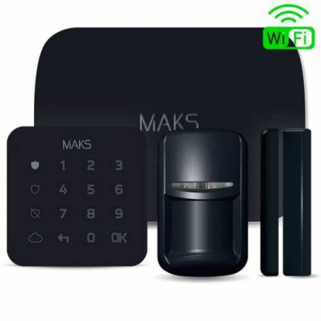 Стартовый комплект беспроводной системы безопасности MAKS. В набор входят базовый блок MAKS PRO (с поддержкой Wi-Fi), датчик движения MAKS PIR, универсальный датчик открытия окна/двери MAKS WDS mini и клавиатура MAKS Keypad mini. Цвет: черный