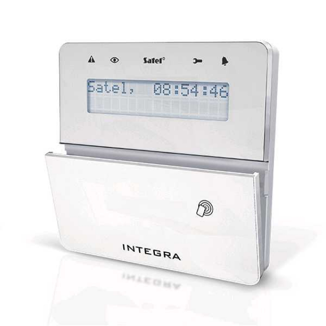 Клавиатура системы охранной сигнализации INTEGRA со считывателем проксимити карт. Подсвтека клавиш и дисплея, вызов тревоги с клавиатуры, 2 программируемые зоны, разъем RS-232 для работы с программой GUARDX. Цвет корпуса: белый фронт и тыл, серебрянн...