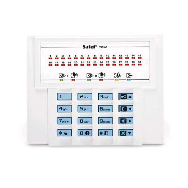 Светодиодная клавиатура для ППК серии VERSA. Светодиоды для индикации состояния групп. Быстрая постановка на охрану. Звуковая сигнализация выбранных системных событий. Подсветка клавиш: голубая