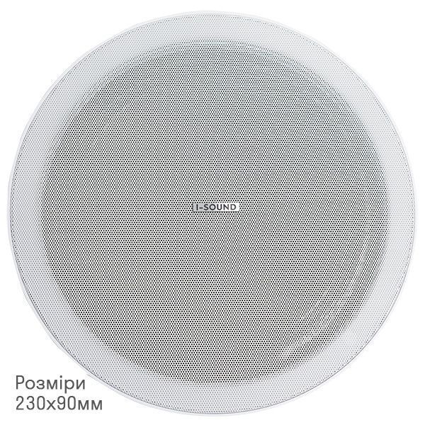 Стельовий гучномовець I-Sound IS-CS810 (8”, потужність 5-10Вт / 100В, без рамки, діапазон 100-18кГц, врізний, матеріал – пластик, діаметр –210мм, колір білий, габарити – 230 х 90 мм, вага – кг)