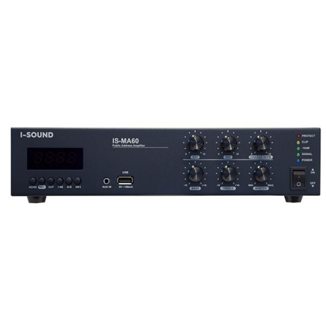 Агент 007™ » Речевое оповещение » I-Sound » Настільний мікшуючий підсилювач з медіаплеєром I-Sound IS-MA60 (1 зона, потужність до 60Вт, 100В/70В 4 Ом, діапазон 80 Гц-17 кГц, підтримка 3-х джерел аудіо сигналу, USB-TF Card/FM/Bluetooth 100V-240В/ 95Вт, габарити 270х60х190 мм, Вес 2.5 кг)
