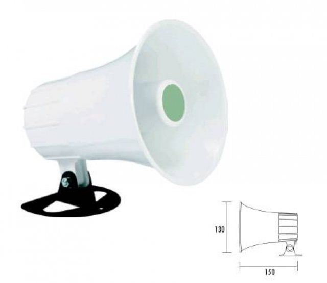 Рупорный громкоговоритель для наружной установки. Выходная мощность: 10 Вт (8 Ом). 102 дБ. 250 Гц - 18 кГц. Степень защиты IP66. Крепится к монтажному кронштейну. Масса 0,5 кг. Размеры 130 х 150.