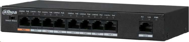 DH-PFS3009-8ET-96 – це 8-портовий PoE комутатор з підтримкою режиму роботи CCTV (передача PoE на лінії до 250 метрів). Забезпечує швидкість передачі портами в стандартному режимі 100 Мбіт/с, в режимі CCTV 10 Мбіт/с. Перемикання режимів роботи здійснюється перемикачем DIP на лицьовій панелі пристрою.