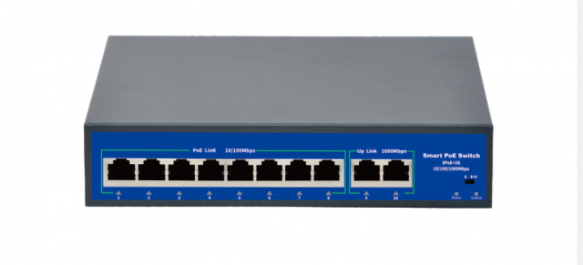 8-портовый PoE коммутатор. Дальность передачи до 250м. Downlink порты: 8x RJ45 (100M); Uplink порты: 2x RJ45 (1000M); Протоколы: IEEE802.3af/at; AC 100~240В, встроенны БП. -10°С до +55°С; 200x118x44 мм