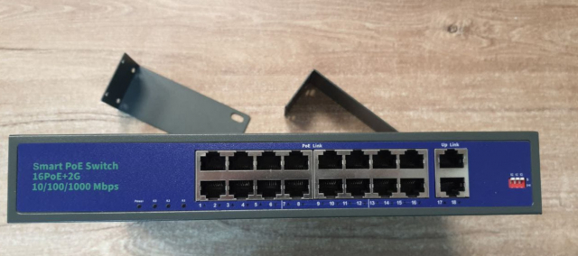 16-портовый PoE коммутатор. Дальность передачи до 250м. Downlink порты: 4x RJ45 (100M); Uplink порты: 2x RJ45 (1000M); Протоколы: IEEE802.3af/at; AC 100~240В, встроенны БП. -10°С до +55°С; 270x180x44 мм