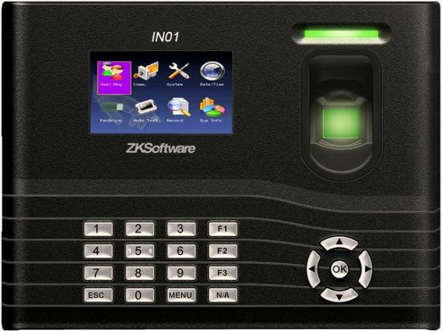 IN01 – інноваційний термінал обліку робочого дня. Вбудована резервна батарея ємністю 2000мА забезпечує безперервну роботу у разі вимкнення зовнішнього живлення. Пристрій може забезпечувати роботу в мережах GPRS чи WI-FI. Пристрій використовує найшвидший комерційний алгоритм розпізнавання відбитків пальця, а також високопродуктивний оптичний сенсор ZK, що забезпечує високу якість зображення.