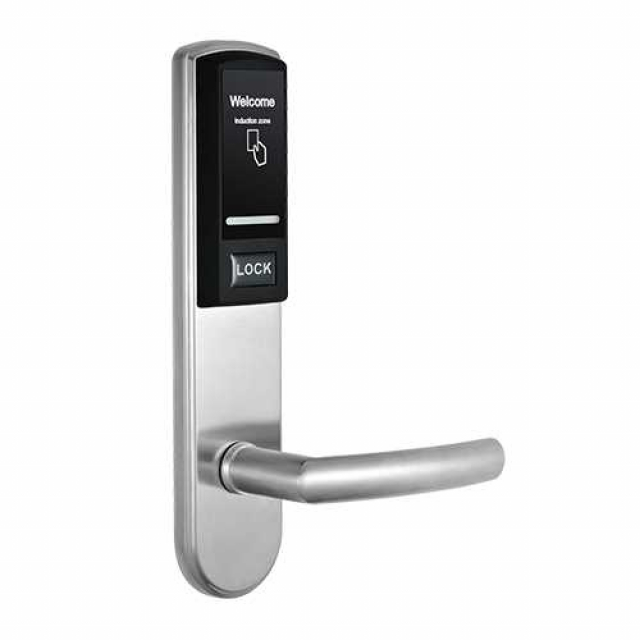 Готельний електромеханічний замок із вбудованим автономним контролером і зчитувачем Mifare 13.56МГц. Живлення: 4 батарейки типу АА. Тип дверей: ліві відчиняються назовні