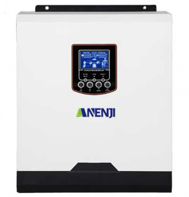 Гібридний інвертор ANENJI SVP-3KW 24V – це гібридний інвертор потужністю 3000Ватт, що може забезпечити живлення підключених навантажень, використовуючи фотоелектричну потужність, енергію від мережі та від акумулятора. Залежно від різних варіантів живлення, цей гібридний інвертор призначений для безперервного виробництва електроенергії від PV сонячних модулів (сонячних панелей), батарей, або мережі. Коли вхідна напруга MPP фотоелектричних модулів знаходиться в прийнятному діапазоні, цей інвертор здатний генерувати електроенергію для живлення мережі і зарядки акумулятора.
