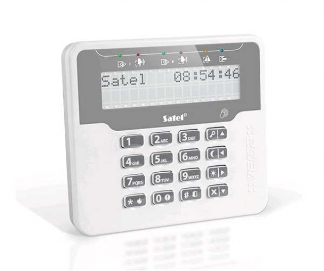 Клавиатура с ЖКИ дисплеем и считывателем бесконтактных карт для ППК VERSA. Большой удобный ЖКИ-дисплей. Светодиоды, индицирующие состояние разделов и системы. Вызов с клавиатуры тревог. Подсветка дисплея и клавиш