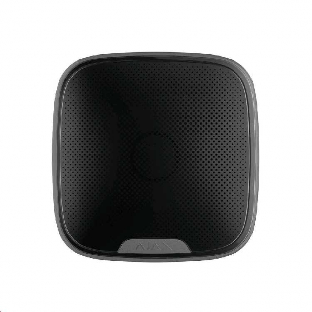Звукова сигналізація з налаштованим рівнем звуку від 81 до 105 дБ. Працює на значній відстані від Ajax Hub: 1500 метрів відкритого простору. Живлення від джерела постійного струму 12В або вбудованих батарей. Харчування без зміни батареї - до 5 років